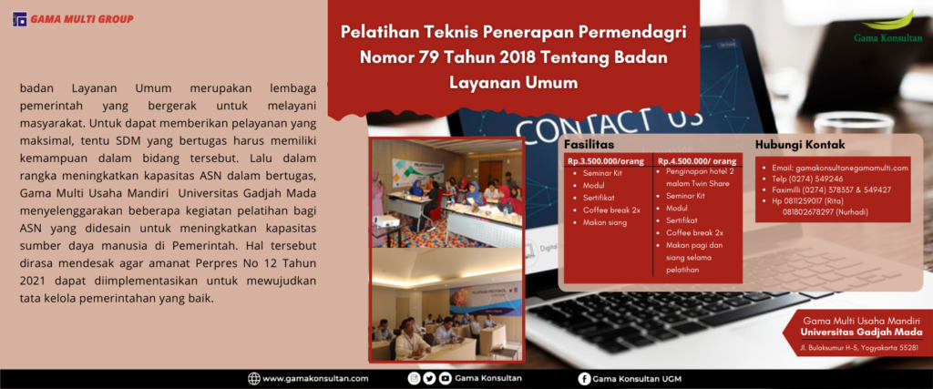 Berdasarkan Permendagri Nomor 79 Tahun 2018, Gama Konsultan menyelenggarakan kegiatan pelatihan bagi pemerintah, khususnya pemerintah daerah yang membutuhkan peningkatan mutu dalam badan layanan umumnya.